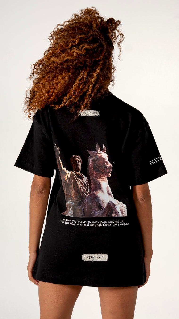 This oversized tee in Bulldog fabric channels ancient wisdom through a modern lens. Featuring a striking graphic of Marcus Aurelius and his steed, it reminds us that fate shapes all that matters. With its structured drape and thoughtful details, this piece is built for those who lead quietly, move intentionally, and wear meaning with ease.