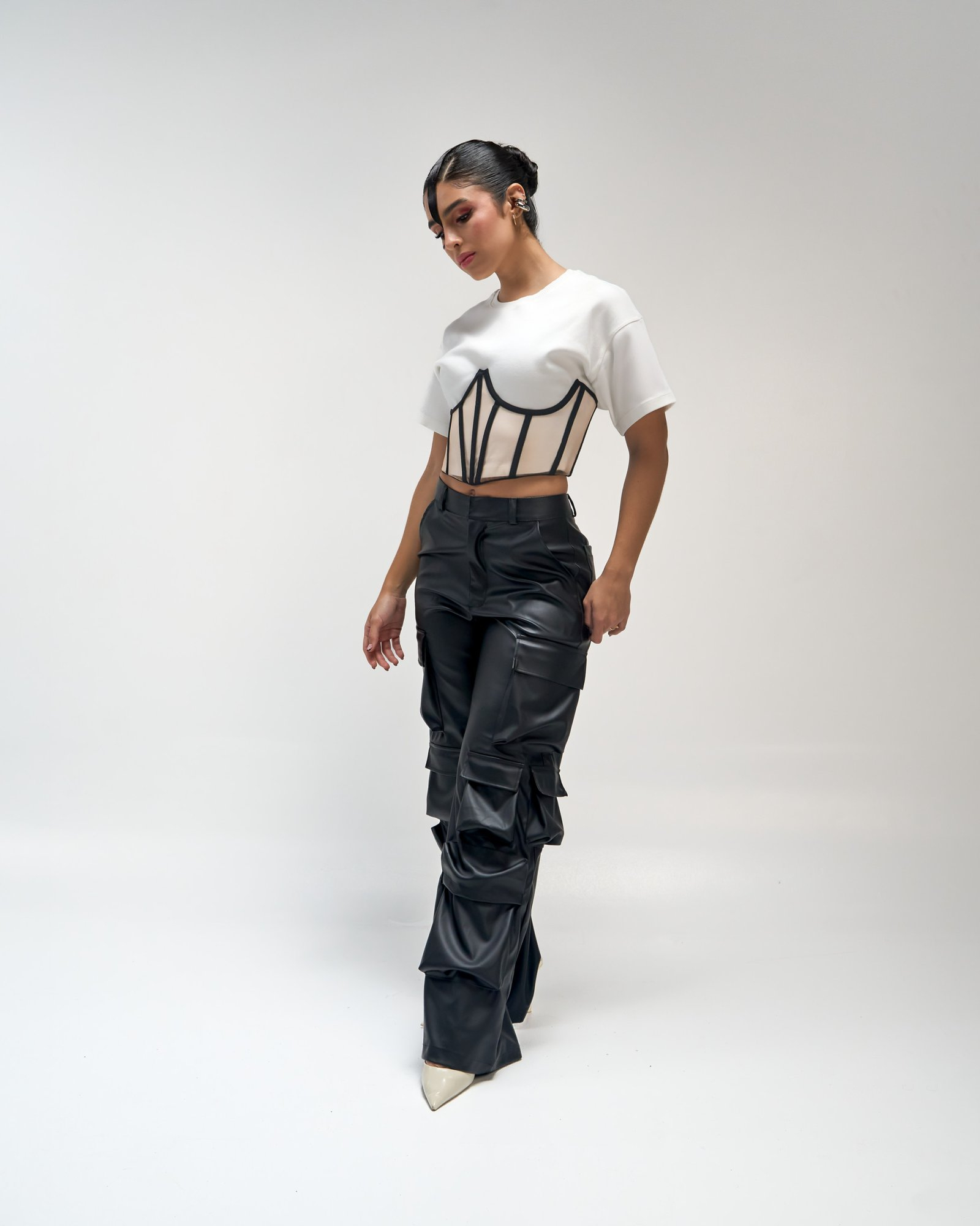 Sophisticated strapless corset crafted in premium black and beige faux leather. Featuring a sleek, structured design that enhances the silhouette, perfect for versatile styling or layering for an elegant statement look.