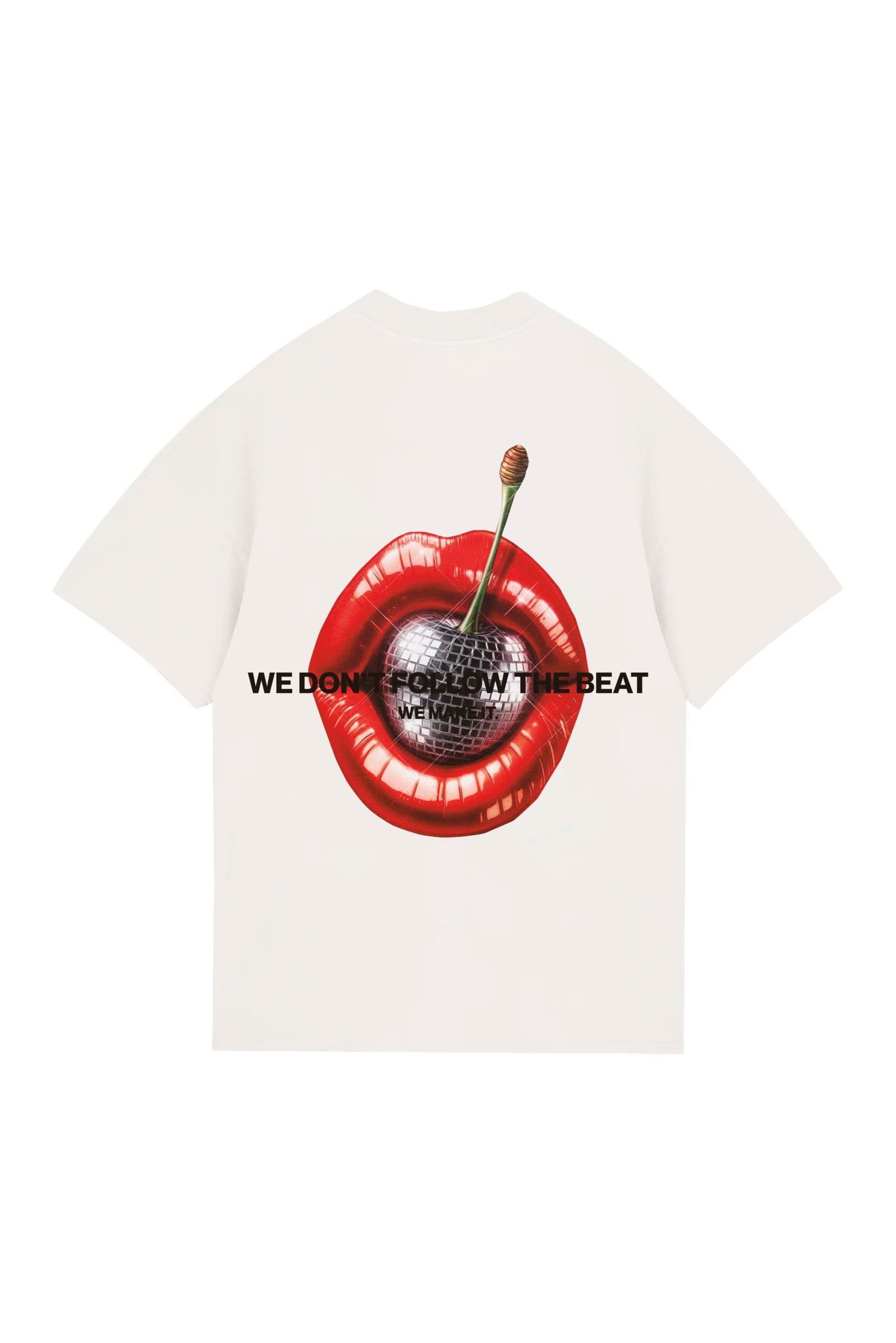 An oversized tee that speaks louder than words. Featuring glossy red lips holding a cherry disco ball and the bold message “WE DON’T FOLLOW THE BEAT, WE MAKE IT,” this piece is made for rule-breakers and rhythm-makers. Minimal up front, unapologetically expressive at the back. Made with premium cotton for maximum comfort, relaxed fit, and long-lasting wear. A must-have for those who dare to set the tone.